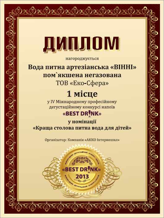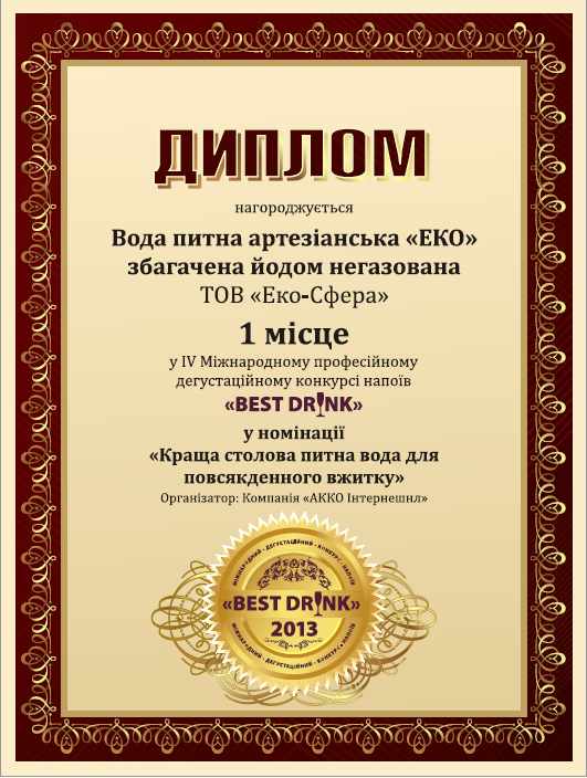 Компанія «Еко-Сфера» створила виробництво по розливу води, що з турботою ставиться до навколишнього середовища. Це підтверджує сертифікат якості «ISO 14001». Він свідчить про високий рівень екологічності та нешкідливості виробництва для природи.